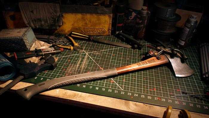 Usa tu arma cuerpo a cuerpo durante mucho tiempo y notarás que una línea de durabilidad que te informa cuánto tiempo puede durar un arma comienza a degradarse. Para reparar tu arma, necesitarás encontrar un banco de trabajo. Si ha encontrado uno antes, regrese allí para ver este ejemplo.