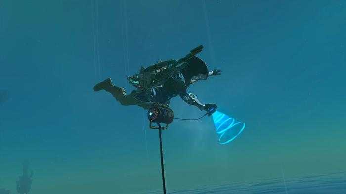 Acérquese a esta plataforma y use la habilidad Ultrahand para manipular tablones. Pon uno en el agua y luego salta rápidamente. Una vez hecho esto, deja que tu personaje siga la corriente y caiga de la cascada. No te preocupes, no sufrirás ningún daño, ya que es una escena especialmente diseñada.