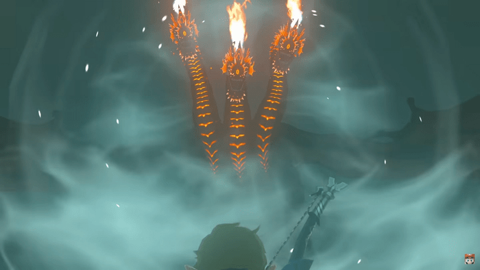 Las primeras imágenes de un dragón de tres cabezas se vieron en el primer tráiler de Tears of the Kingdom, donde un gran monstruo con tres cabezas y llamas en cada fauces se encontraba sobre un gran puente.