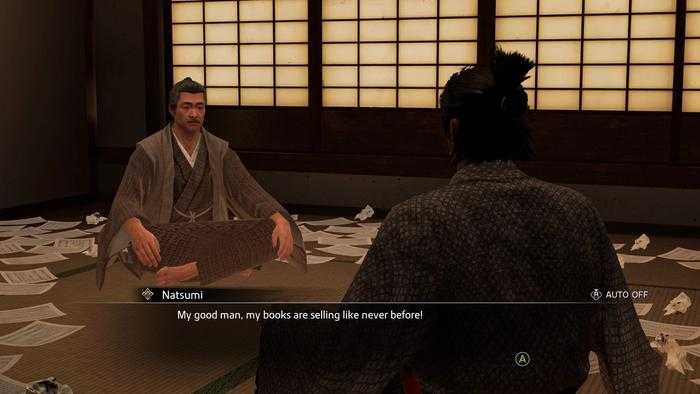 Una vez que se los hayas dado, comenzará furiosamente a escribir la novela. Una vez que deje Teradaya Inn por un tiempo y regrese, podrá preguntarle cómo le fue con su libro anterior. Te recompensará con una Brújula Rota, Tela de Seda Fina y Tela Europea por cada una de las respuestas correctas que le des. ¡También serás recompensado con +300 de Virtud por completar la historia secundaria!