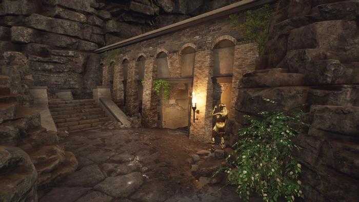 Después de descubrir que necesita una cura para el reumatismo de Lucretia en el santuario de Apolo, salga del santuario y regrese al portal del bucle temporal. En su camino de regreso a allí, esté atento a su derecha para ver un arco en la parte inferior de los escalones. Diríjase a través de este arco y debería ver que es un área llena de pequeños edificios / habitaciones para que viva la gente.