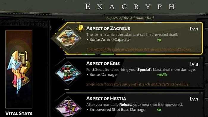 Si quieres seguir con el Exagryph normal, prueba el Aspecto de Eris. Esta bonificación especial te da un impulso de ataque durante cuatro segundos después de que te encuentres en el área de efecto de tu ataque especial. Significa acercarse a su objetivo, lo que puede ser peligroso, pero el beneficio adicional facilita la limpieza de las habitaciones.